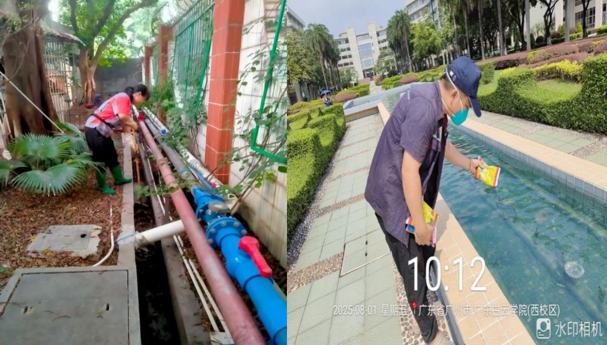 环境整治是防控蚊媒传染病的首要任务,“清积水”是关键环节。学校组织开展“地毯式”清积水行动, 对教学楼、学生宿舍、教师公寓、办公区周边、公共楼道、绿化带、下水道、沙井口、天台排水口等区域,进行全面排查清理。重点清除各类闲置容器、花盆托盘,疏通排水沟渠,确保无积水死角。加强景观水池、消防水池等水体监控,采取定期换水和投放药物防制措施。